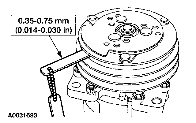 8. Measure and adjust the clutch air gap by removing or adding the A/C clutch hub spacer.