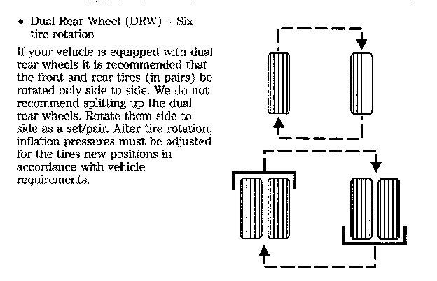 The following procedure applies to vehicles equipped with single rear wheels, if your vehicle is equipped with duel rear wheels it is recommended that only the front wheels be rotated (side to side).