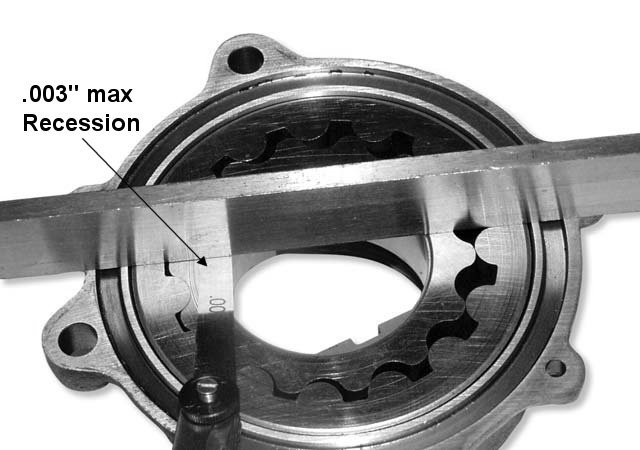 To measure pump wear, place a straight edge across the pump housing and use a feeler gauge to measure clearance between the inner gear and the straight edge. A pump with excess gear recession will contribute to hard start issues.