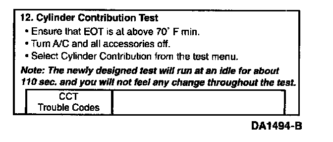 The A/C must be off and engine oil temperature above 21°C (68°F) to run Cylinder Contribution Self Test. This test will determine if all cylinders are contributing equally to engine performance. The PCM will test all eight cylinders continuously during the test; there is no change in engine speed or operation that can be detected by the technician. The test checks for cylinder-to-cylinder decrease in speed and sets a code if the decrease is too high. A fault must be present at the time of testing for the KOER Cylinder Contribution Self Test to detect a fault, so the engine operating condition at which the idle is worst will produce the best test results. If a fault is detected, a Diagnostic Trouble Code (DTC) will be output on the data link at the end of the test when requested by a scan tool. Only a hard fault code (DTC) will be displayed.
