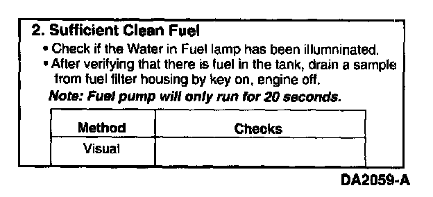 Observe WATER IN FUEL light while cranking. If the lamp is illuminated the fuel is probably contaminated with water.
