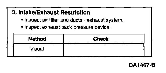 This is a visual inspection to determine if an air intake or exhaust restriction is contributing to a no start or hard start condition. If the engine does start with a high air intake or exhaust restriction, a considerable amount of black/blue smoke is produced.