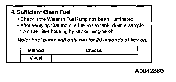 If engine oil is present in the fuel it may indicate an injector O-ring leak and subsequent loss of rail pressure. If that is suspected, check rail pressure during engine cranking (Hard Start/No Start Diagnostic Procedures Step 9C).