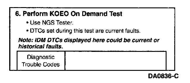 NOTE: The IDM stores both historical and hard IDM fault codes. To retrieve IDM fault codes, you must run KOEO On-Demand Self Test or KOEO Injector Electrical Test. To ensure that the DTC is a hard fault, you must first clear Continuous DTCs (be sure to record all DTCs before clearing) even though IDM codes do not show up on the Continuous display. Rerun KOEO On-Demand Self Test if an IDM DTC is set. This is a hard fault.
