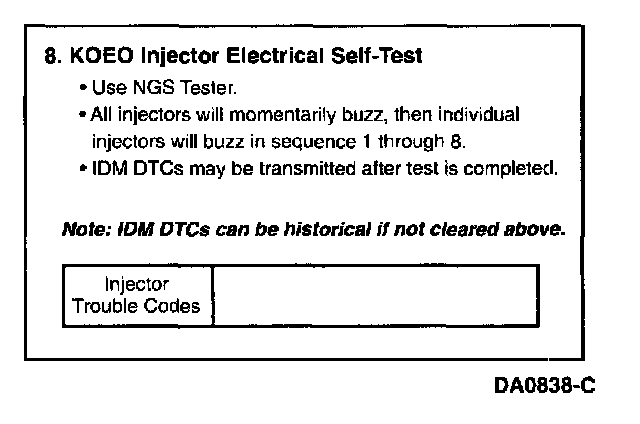 ^ This test determines if the injector circuits and solenoids are electrically operating without fault. All injectors will first buzz together for approximately 2 seconds, then each injector will buzz for approximately 1 second in numerical order (1 through 8). The IDM stores all historical IDM fault codes; to ensure that the DTC is a hard fault, you must first clear continuous DTCs (be sure to record all IDM fault codes before clearing). After clearing, rerun self test; a fault must be present at the time of testing for the KOEO Injector Electrical Self Test to detect the fault. If a fault is detected, a DTC will be output on the data link at the end of the test when requested by a scan tool. Only a hard fault code (DTC) will be displayed.