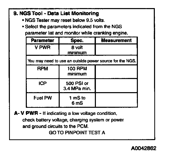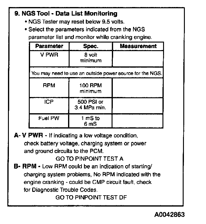 Install NGS Tester. Access FUEL PW PID on NGS Tester and monitor while cranking engine.