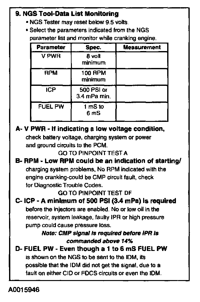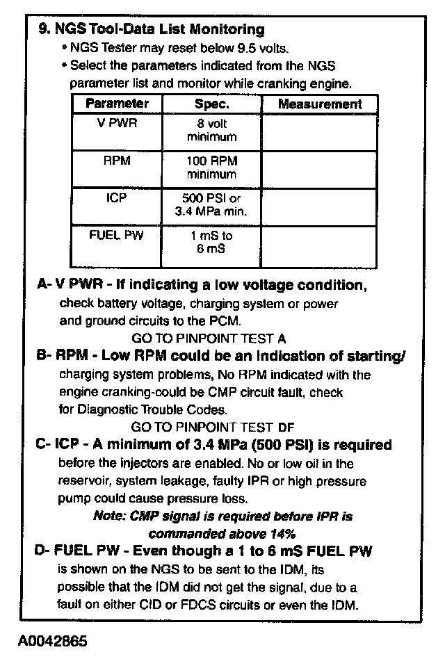 A 1-6 mS fuel pulse width (FUEL PW) will be sent by the PCM to the IDM if system voltage does not go below 7 volts during cranking, engine cranking speed is above 100 rpm and injection control pressure is above 3.4 MPa (500 psi). Even though a 1-6 mS fuel pulse width is shown on the NGS to be sent to the IDM, it is possible the IDM did not get the signal, due to a fault on either the CID or FDCS circuits or even the IDM. Note that low fuel pressure or no glow plugs could still be the cause of the No Start or Hard Start condition. A 0.60-ms fuel pulse width (a no fueling pulse) will be sent by the PCM when a sync pulse has not been received from the CMP sensor and if insufficient injection control pressure is present. This 0.60-ms fuel pulse width will not allow injectors to be enabled, but does keep the IDM and PCM synchronized until sufficient injection control pressure is realized.