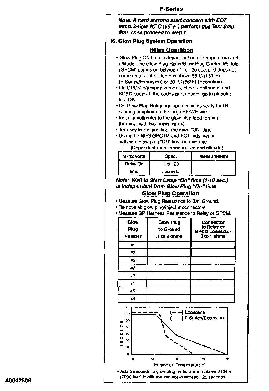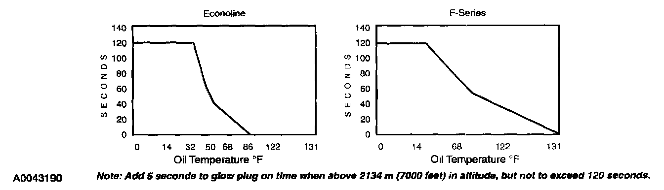 The glow plug on time is dependent on oil temperature and altitude. The glow plug relay (Federal) or GPCM (California) comes on between 1-120 seconds and does not come on at all if oil temperature is above 30°C (86°F) for E-Series or 55°C (131°F) for F-Series. By using the NGS you can run the Output State Self Test which will cycle the glow plug relay on for 5 seconds the first time only that the accelerator pedal is pressed. This self test does not set any codes.