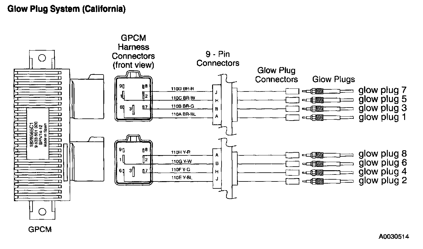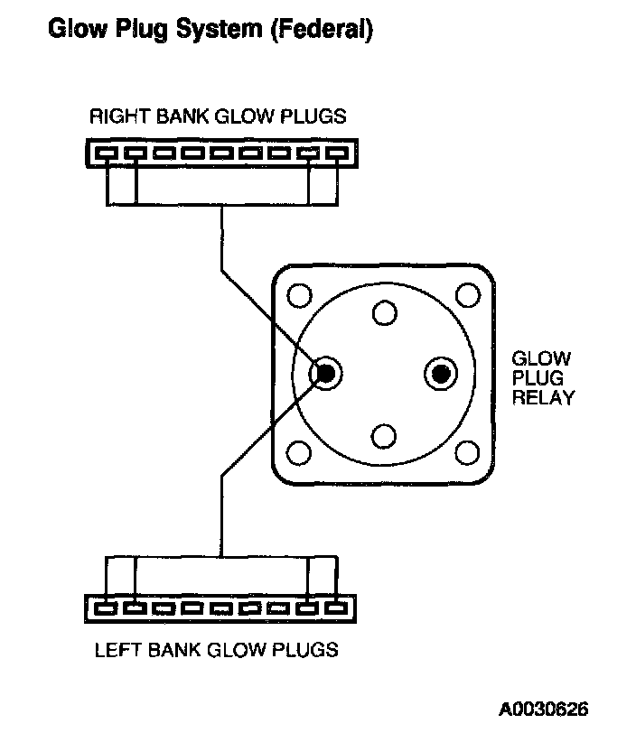 Measure for continuity from the connector harness to the glow plug feed terminal on the glow plug relay (Federal) or to the Glow Plug Control Module (GPCM) (California). Resistance should be less than 1 ohm.