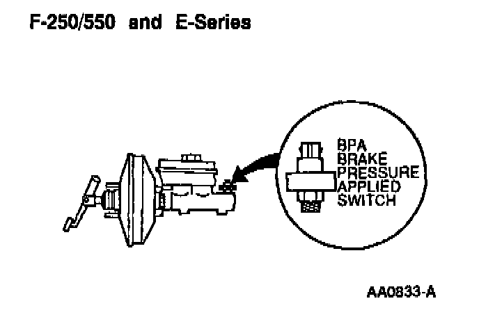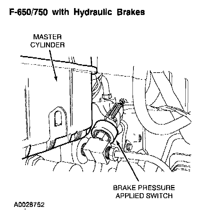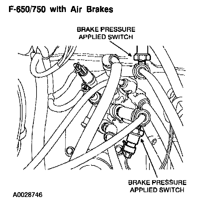 All vehicles with hydraulic brakes have a single Brake Pressure (BP) switch. An air brake equipped F-650/750 vehicle has two BP switches. A BP switch provides a backup for the Brake Pedal Position (BPP) switch. Normally, a brakes-applied signal from the BPP switch will disengage the speed control. If the BPP switch signal is lost, the BP switch will then supply the brakes-applied signal to the speed control servo.