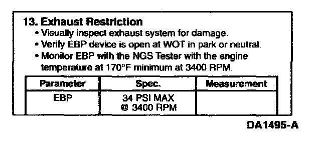 Use NGS Tester PID EBP. An EBP reading above 234 kPa (34 psia) indicates a restricted exhaust condition.