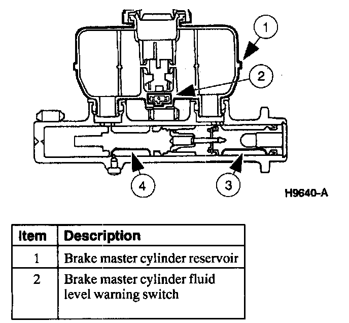 The brake master cylinder fluid level warning switch is an integral part of the brake master cylinder reservoir. It consists of a float containing a magnet and a reed switch mounted in the bottom of the brake master cylinder reservoir.