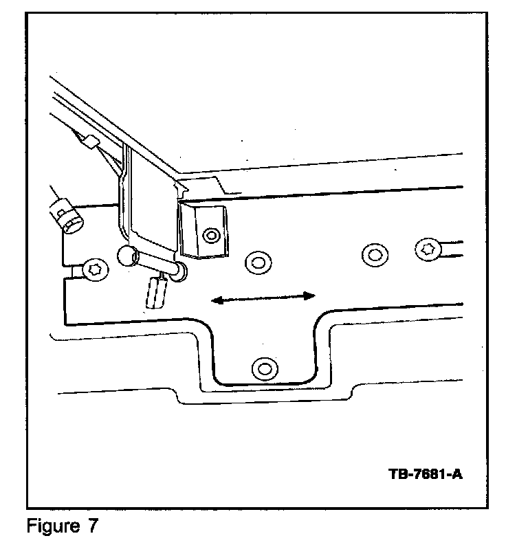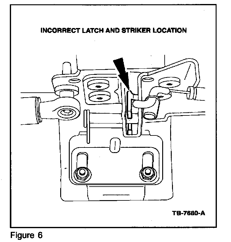 THE TONNEAU COVER MAY HAVE SHIFTED FORWARD OR BACKWARD ON THE PICKUP BOX. THIS CAN BE DETERMINED BY CHECKING WHERE THE LATCHES HIT THE STRIKER. THE LATCHES SHOULD HIT THE CENTER OF THE STRIKER (FIGURE 5). IF THE LATCHES ARE SET TOO FAR TO THE FRONT OR REAR OF THE STRIKER (FIGURE 6), THE CENTER-MOUNTING BRACKET MAY ALSO NEED TO BE ADJUSTED SO THE LATCH HITS THE MIDDLE OF THE STRIKER (FIGURE 7).