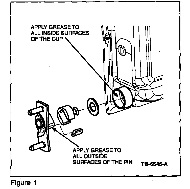 4. Apply grease (use only XG-3), to all inside surfaces of right and left side hinge cups and right and left side body side pins (Figure 1) and re-install plastic inserts into tail gate.