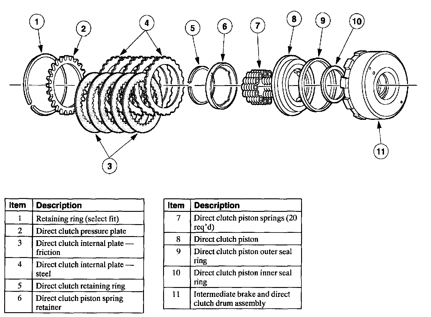 - Inspect the direct clutch pressure plate for scores on the clutch plate bearing surface. Check the clutch release springs for distortion.