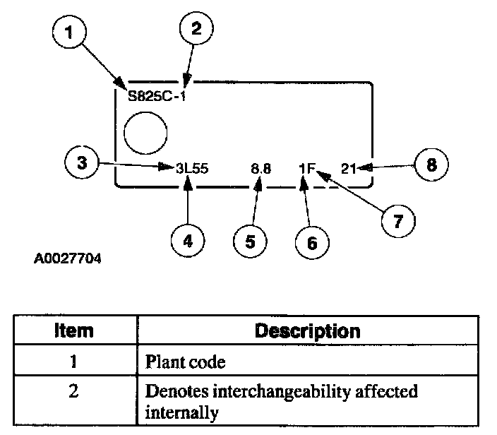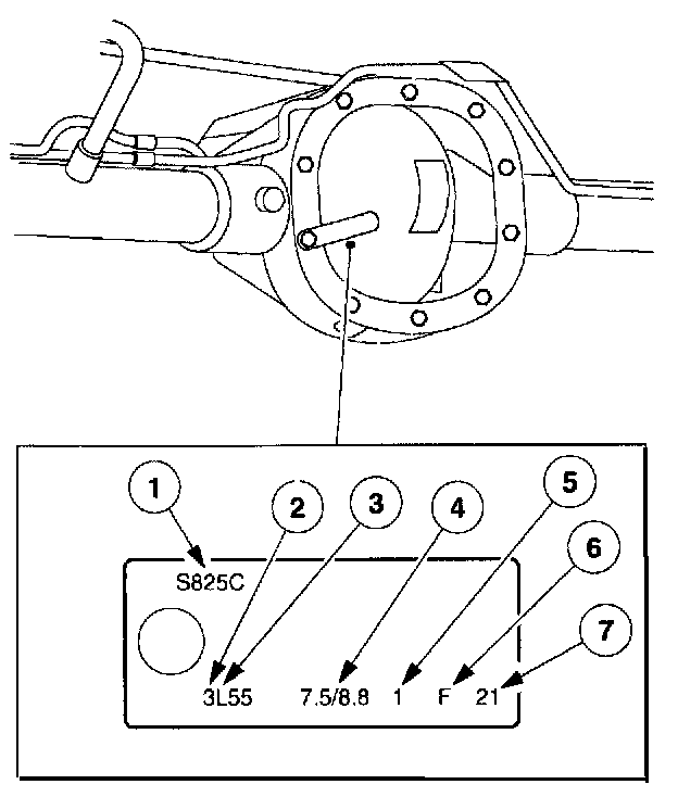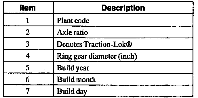 The axle identification tag identifies a particular axle design, a specific ratio, and if it is a conventional or limited slip (Traction-Lok)) type. In addition, the plant code will not change as long as that particular axle assembly never undergoes an external design change. If, however, an internal design change takes place during the production life of the axle and that internal change affects parts interchangeability, a dash and numerical suffix is added to the plant code. This means that as an assembly both axles are interchangeable; however, internally they are different. Therefore, each requires different internal parts at the time of repair.
