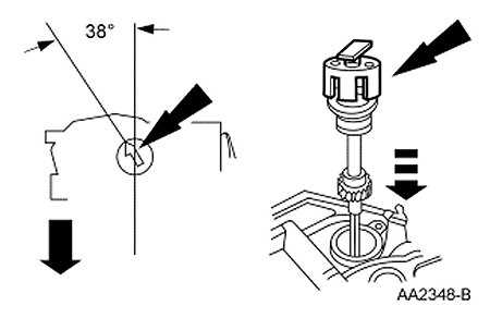 2. Install the camshaft synchronizer housing assembly so the arrow on the special tool is 38 degrees from the centerline of the engine.