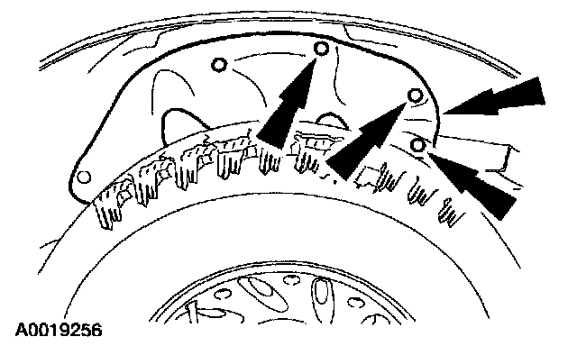 NOTE: The two lower nuts and studs are accessible through the inner fender well.