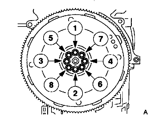 Position the flywheel and install the bolts. Tighten the bolts in the sequence shown in two stages.