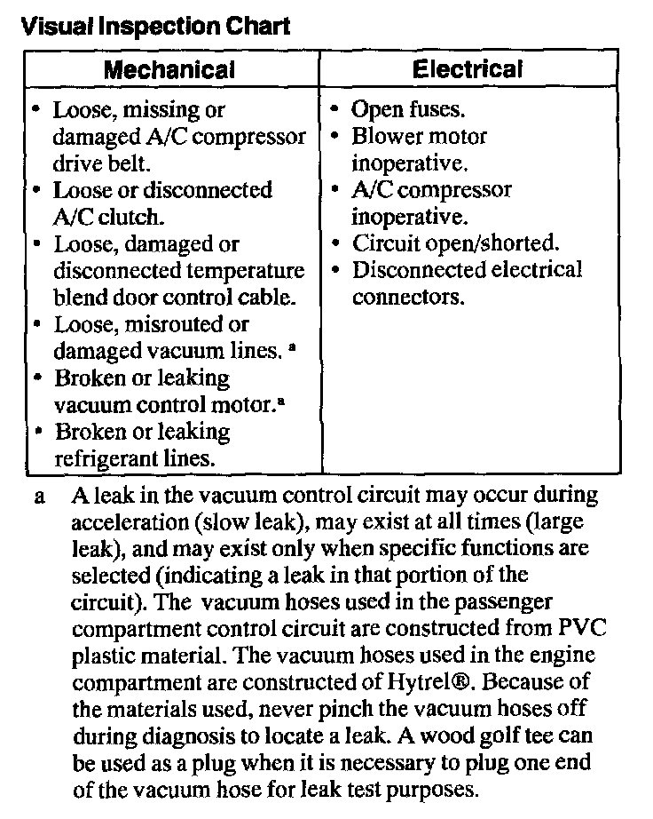 1. Verify the customer's concern by operating the climate control system to duplicate the condition.Visual Inspection Chart: