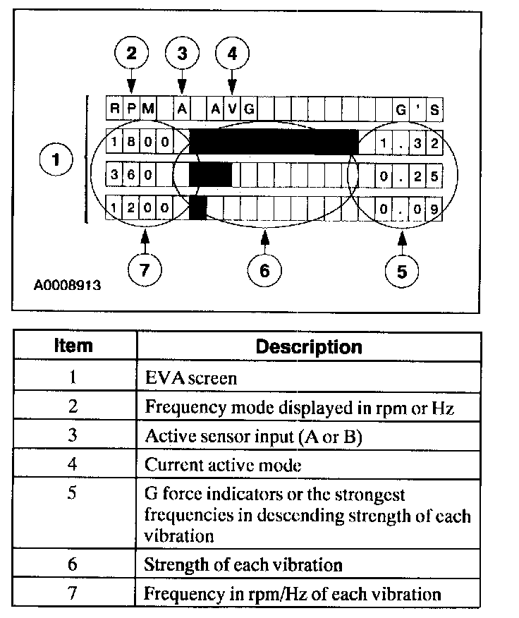 The EVA is a hand-held electronic diagnostic tool which will assist in locating the source of unacceptable vibrations. The vibration sensor can be remotely mounted anywhere in the vehicle for testing purposes. The unit displays the three most common vibration frequencies and their corresponding amplitudes simultaneously. A bar graph provides a visual reference of the relative signal strength (amplitude) of each vibration being displayed and its relative 6 force. The keypad is arranged to make the EVA simple to program and use. Some of the functions include the ability to average readings as well as record, play back and freeze readings. The EVA has a strobe balancing function that can be used to detect imbalance on rotating components such as a drive shaft or engine accessories.