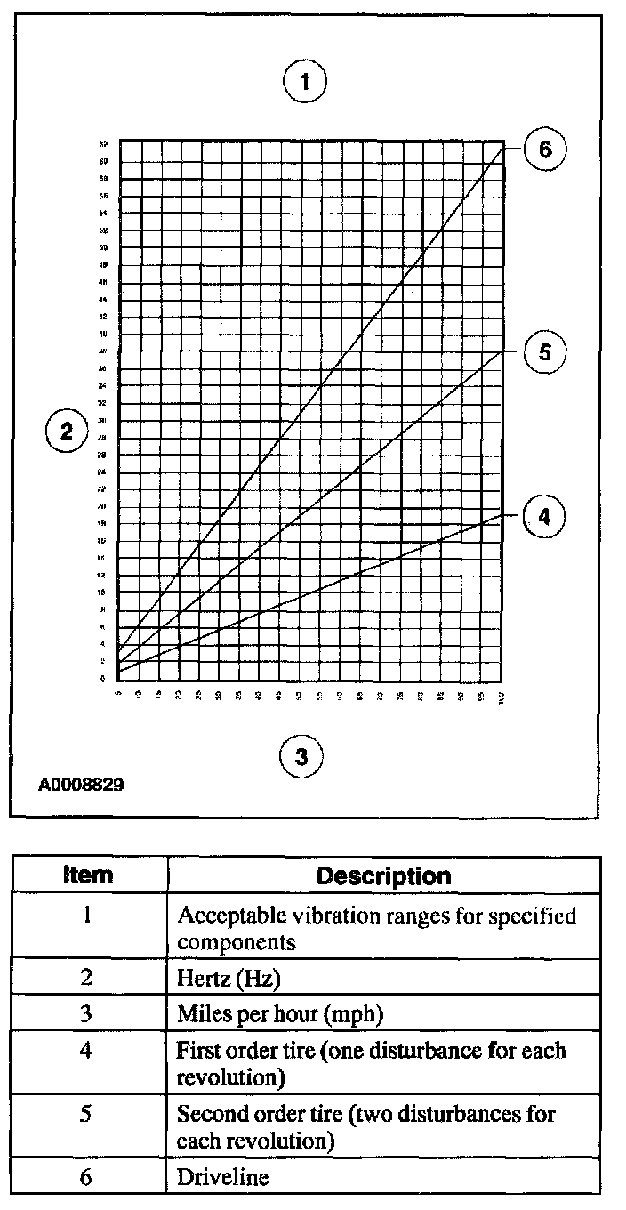 ^ Road test the vehicle at the speed where the vibration is most noticeable. Record the vibration frequency (rpm) and the engine rpm on the worksheet graph. The point on the graph where the vibration frequency (rpm) reading and the engine rpm reading intersect indicates the specific component group causing the concern.
