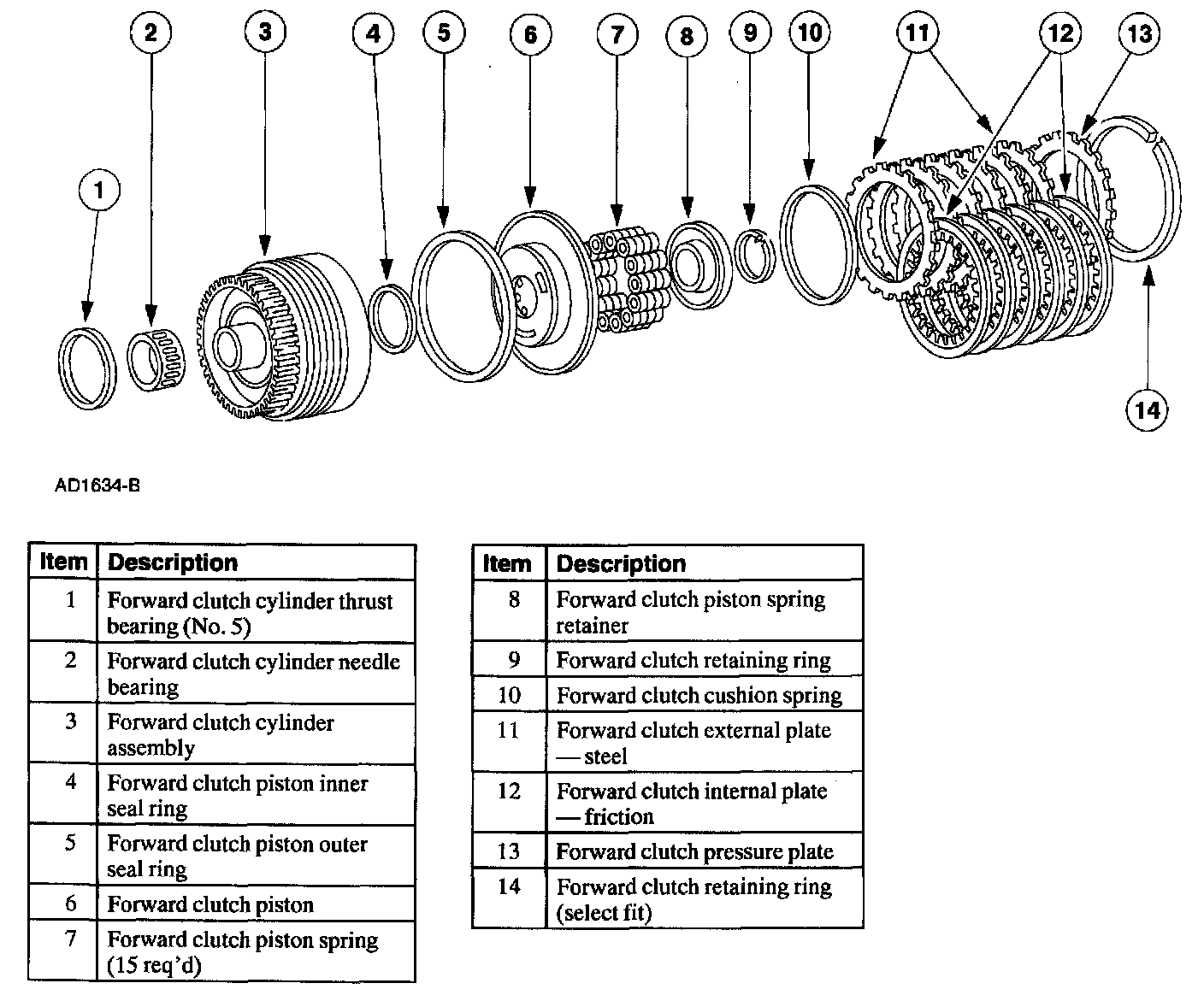 - Inspect the forward clutch plates for wear, damage or overheating.