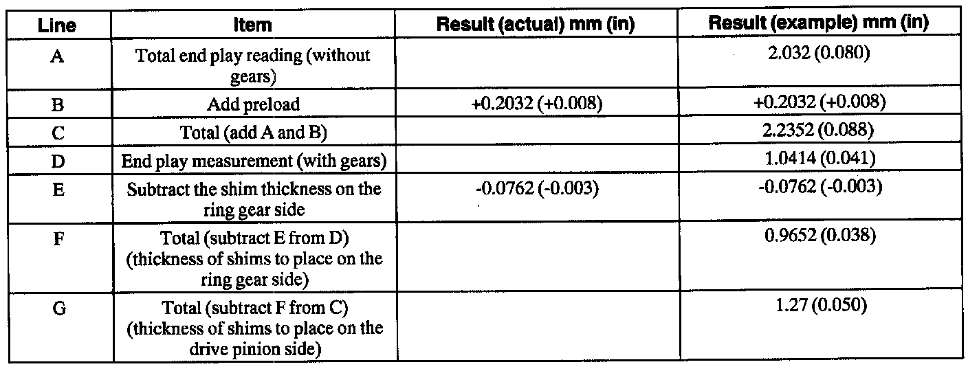31. Complete the worksheet, and select the appropriate thickness differential shims. New differential shims are available in 0.0762 mm (0.003 inch), 0.127 mm (0.005 inch), 0.254 mm (0.010 inch), and 0.762 mm (0.030 inch) thickness.