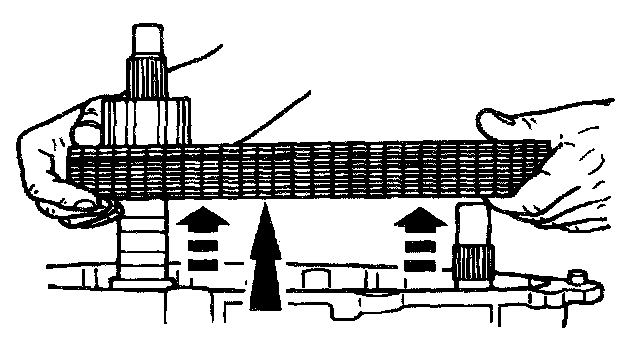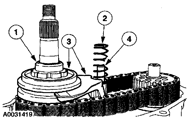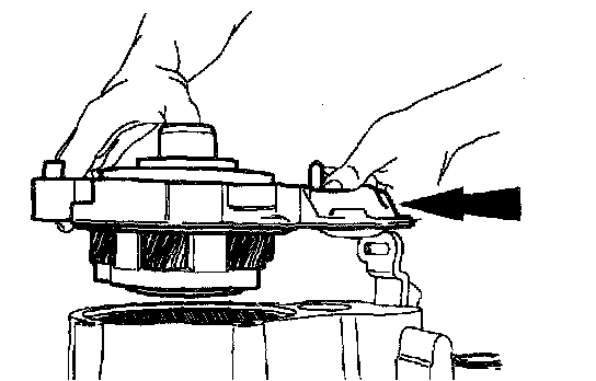 24. Using snap ring pliers, expand the tangs of the large snap ring and remove the complete carrier assembly and the input shaft assembly from the front adapter.