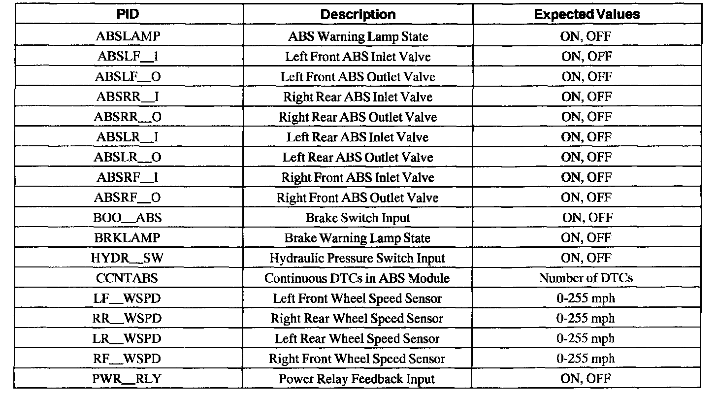 ABS Control Module Parameter Identification (PID) Index