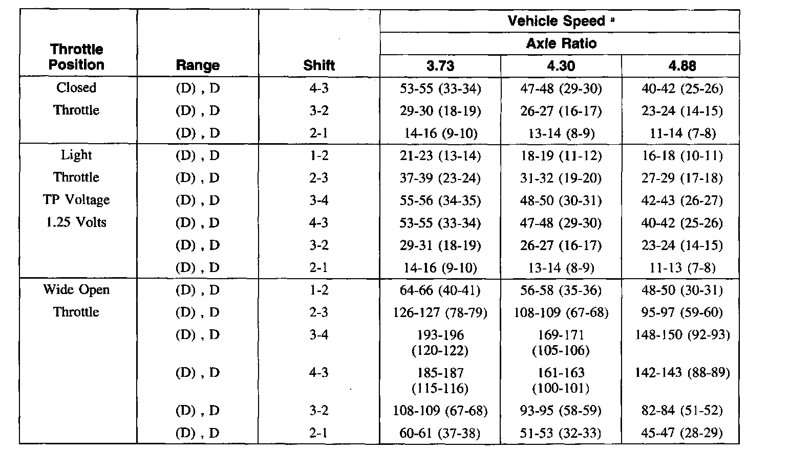 Nominal shift speed at sea level is shown. Actual shift speed will depend on tire brand, size and axle ratio.