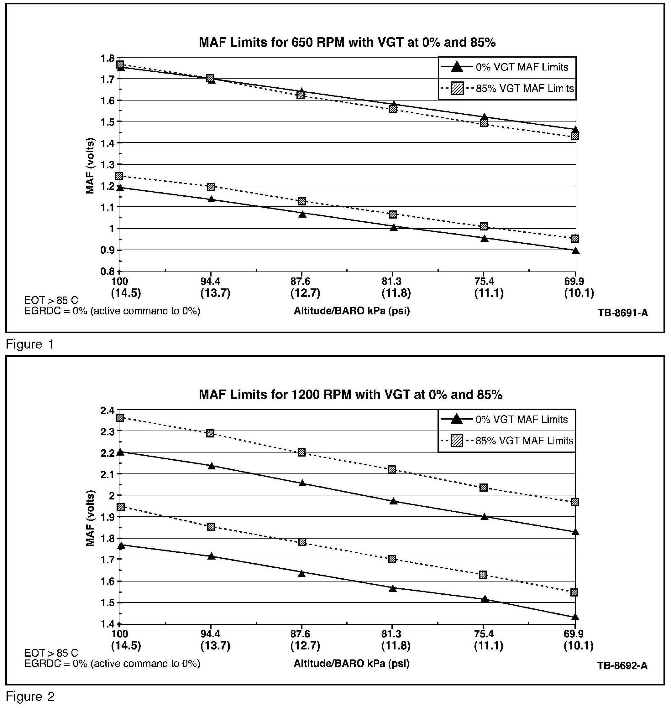 c. Compare the voltage to Figures 1 and 2. Reading is outside of MAF limits and/or recorded value is lower than limits, possible causes are: