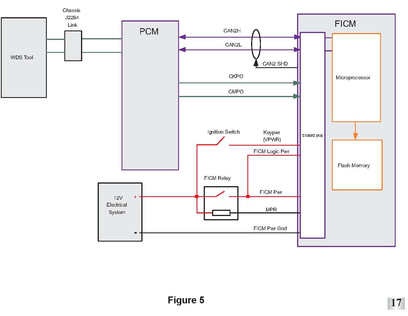 To program the FICM a WDS tool downloads the new program information to the PCM which serves as a gateway to the FICM. The PCM transfers the program to the FICM.
