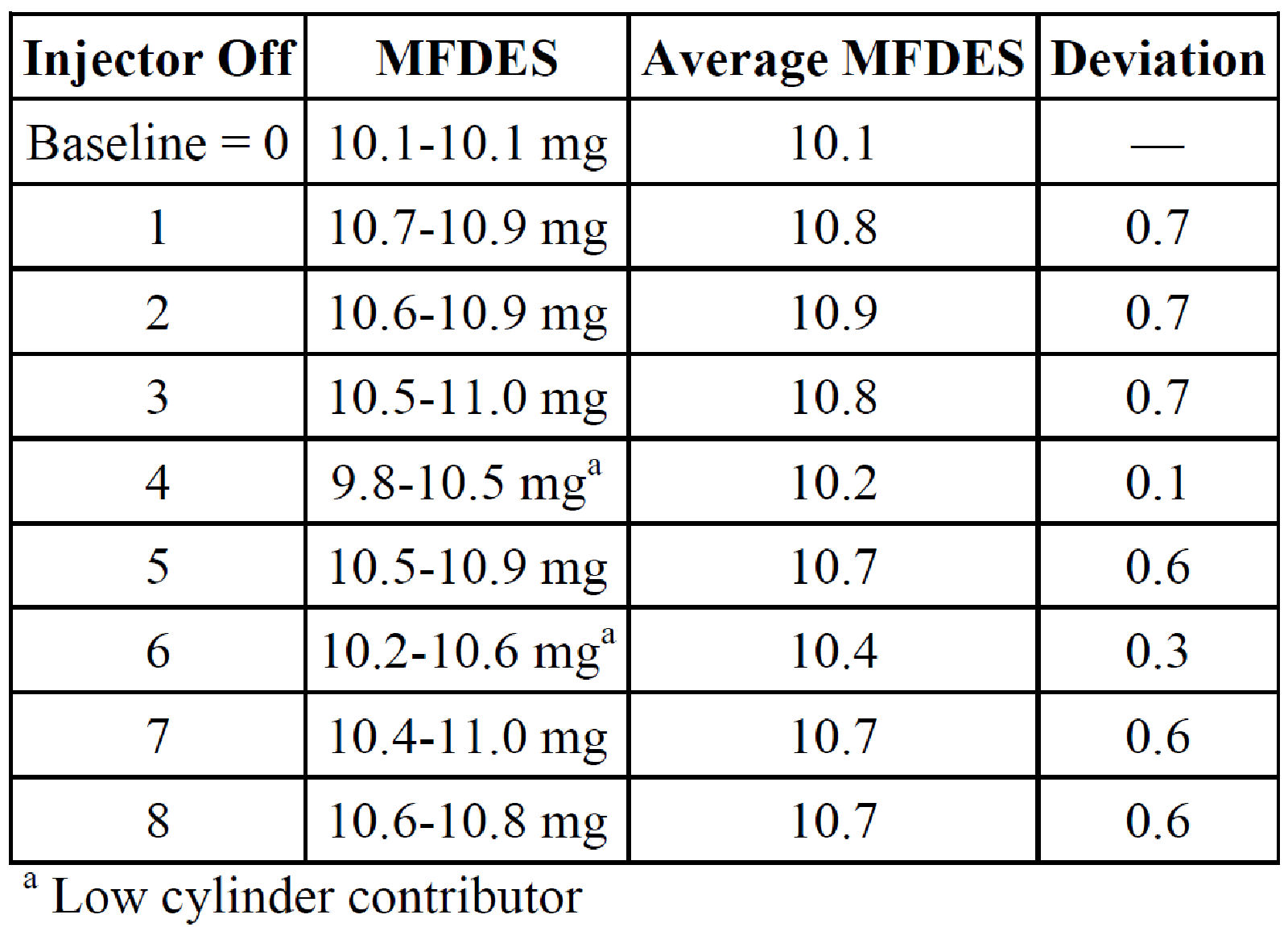 In order to get the cutoff number, average all of the deviations. For example, as in the sample we would add the following numbers: 0.7 + 0.7 + 0.7 + 0.1 + 0.6+0.3+0.6 + 0.6 - 4.3. Divide the sum by eight and round to the nearest tenth: 4.3 + 8 = 0.5375 0.5. Therefore, 0.5 would be the cutoff line for weak cylinders/injectors. By using this test, cylinders No.4 and 6 have been identified as being weak.