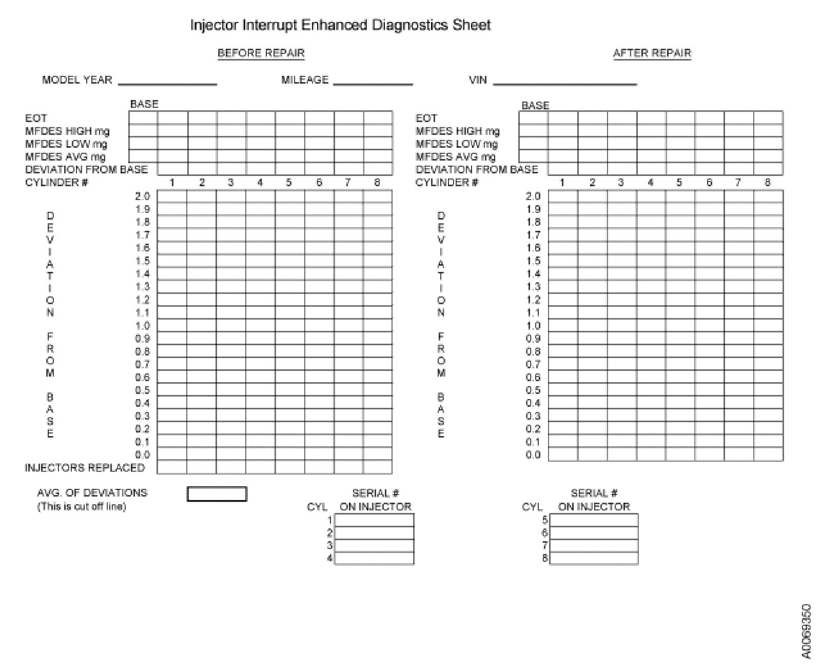 Start the engine and monitor the EOT the EOT is to be maintained within 5°F during the test. The test must be performed while rough idle is occurring. Record the MFDES reading before interrupting any injectors; this will be the baseline for the rest of the test. The MFDES reading will not steady and will fluctuate rapidly. Take a five second snapshot of the PID information and record the high and low MEDES readings on the Injector Interrupt Tool Enhanced diagnostics sheet, using only MEDES numbers that have appeared at lease two times during the recording. Afier recording a baseline, interrupt each injector individually and repeat the above steps to obtain the high and low readings while each injector is interrupted. These numbers should be recorded on the Injector Interrupt Tool Enhanced diagnostic sheet.