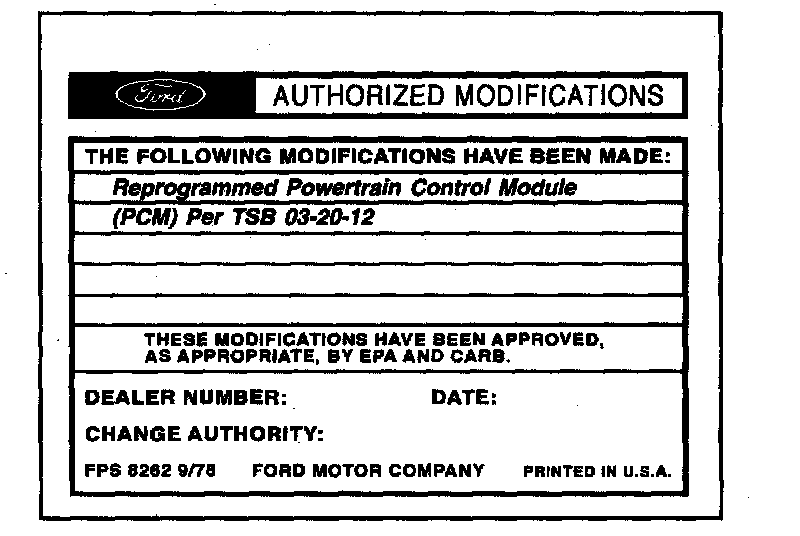 Obtain an Authorized Modifications Decal (FPS 8262 - obtainable through DOES II, 25/pkg) and list the date, dealer number, and summary of modifications performed. Select a prominent place adjacent to the Vehicle Emission Control Information Decal suitable for installing the Authorized Modifications Decal. Clean the area, install the decal, and cover it with a clear plastic decal shield.