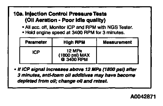 Install NGS Tester. Turn A/C off. Access ICP PID on NGS Tester and monitor ICP pressure. Operate the engine at 3400 rpm for 3 minutes. This test should be performed with engine at normal operating temperature.