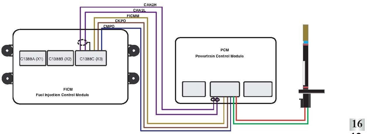 Engine Wiring Harness FICM SYNC occurs through two circuits between the FICM and PCM Verity engine wiring harness circuits CMPO and CKPO If one of these two circuits has a short/open, FICM SYNC will not occur.