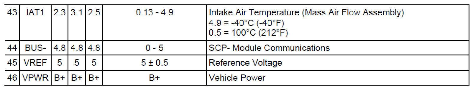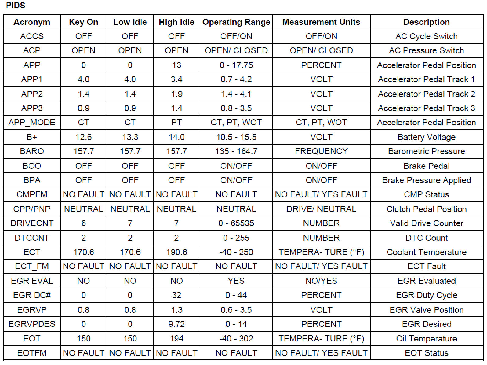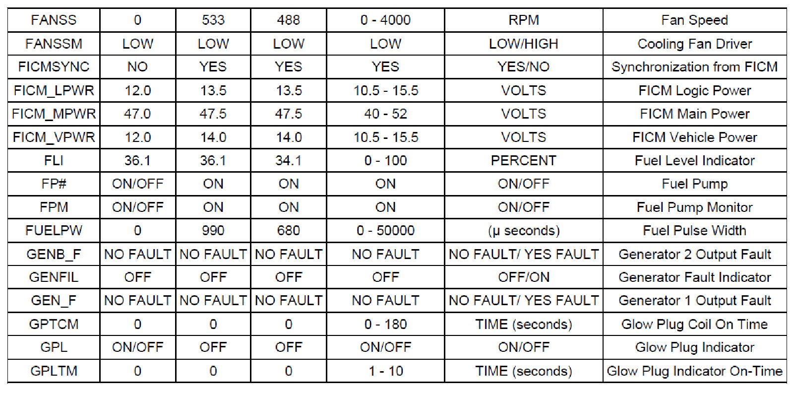 Normal Scan Data Values - Includes PIDs