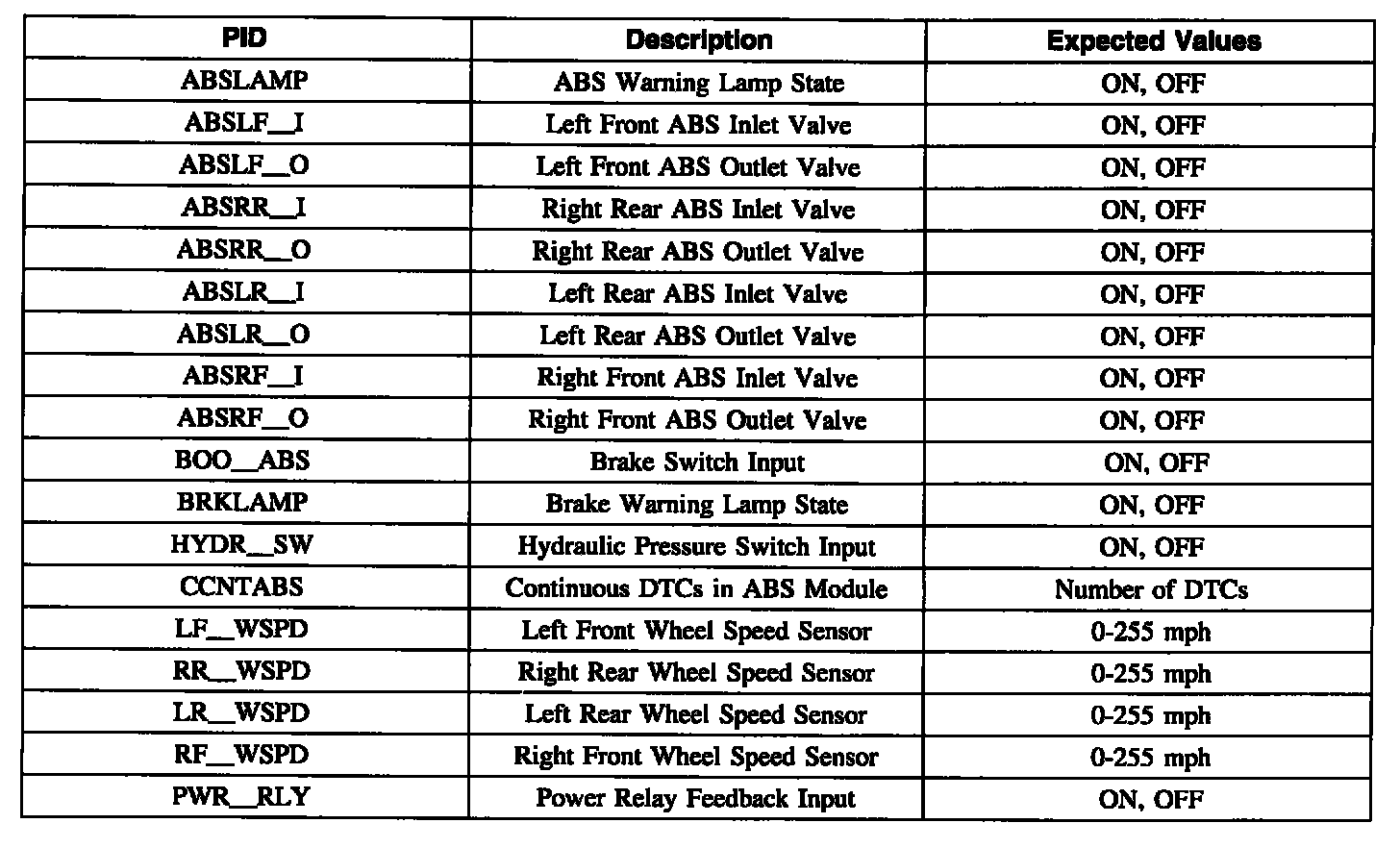 ABS Control Module Parameter Identification (PID) Index