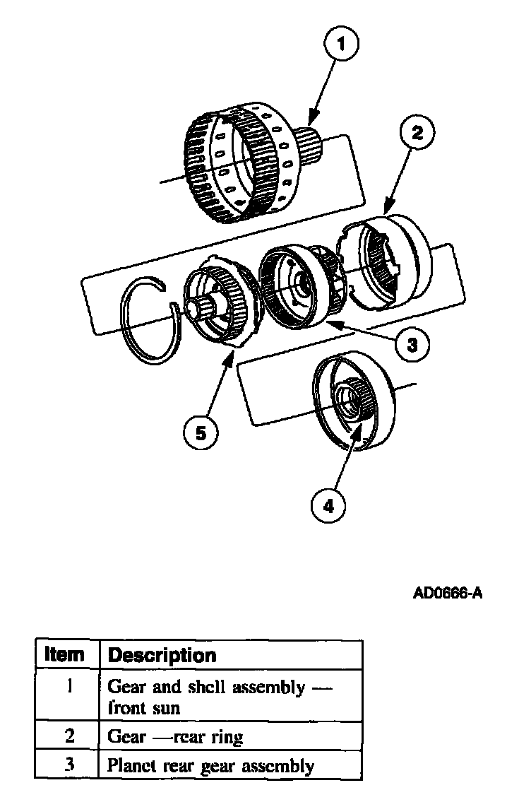 The sun gear is splined to the front ring gear and rear carrier of the planetary gearsets. The sun gear acts as the driving member and the carrier as the driven member. The ring gear is held stationary inside the case using lugged teeth.