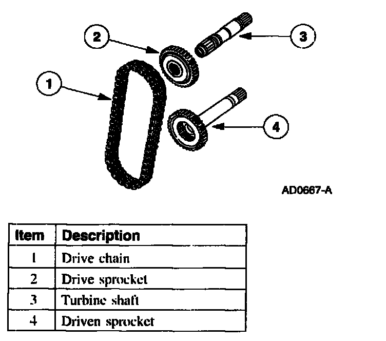 A chain drive transfers torque from the torque converter turbine to the planetary gearsets. The chain drive is composed of the following components:
