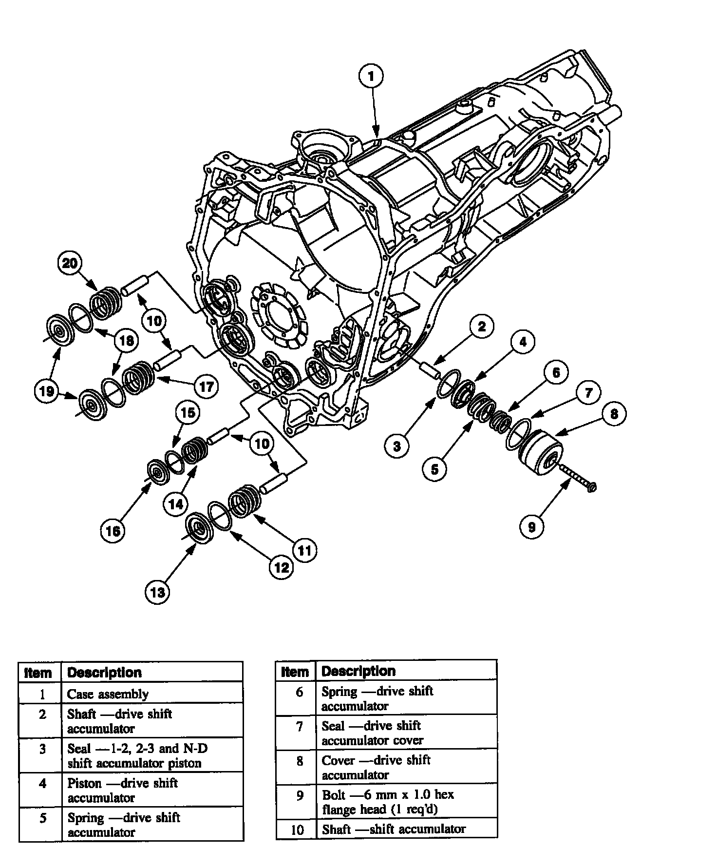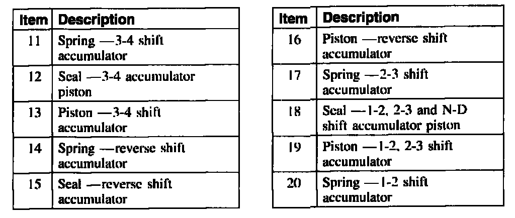 The hydraulic system has accumulators in circuits for five apply components. Each accumulator has a piston (with seal and spring) positioned on a hollow shaft.