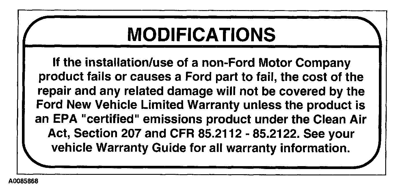 Modifications or additions to the vehicle may cause incorrect operation of the OBD system. Performance modifications that cause a Ford part to fail may not be covered by the Ford New Vehicle Limited Warranty. Burglar alarms, cellular telephones and CB radios must be carefully installed. Do not install these devices by tapping into or running wires close to powertrain control system wires or components.