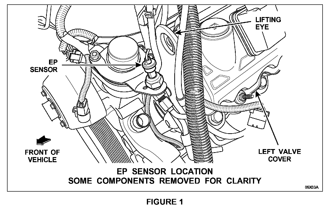 The EP sensor is located on a bracket directly in front of the left cylinder head between the front lifting bracket and the charge air cooler (CAC) tube. All splices are to be made using tools provided in the Rotunda Wire Splice Tool Kit 164-R5903. The repair kit contains the connector and pigtails, buff splice connector, and heat shrink tubing. See Figure 1.