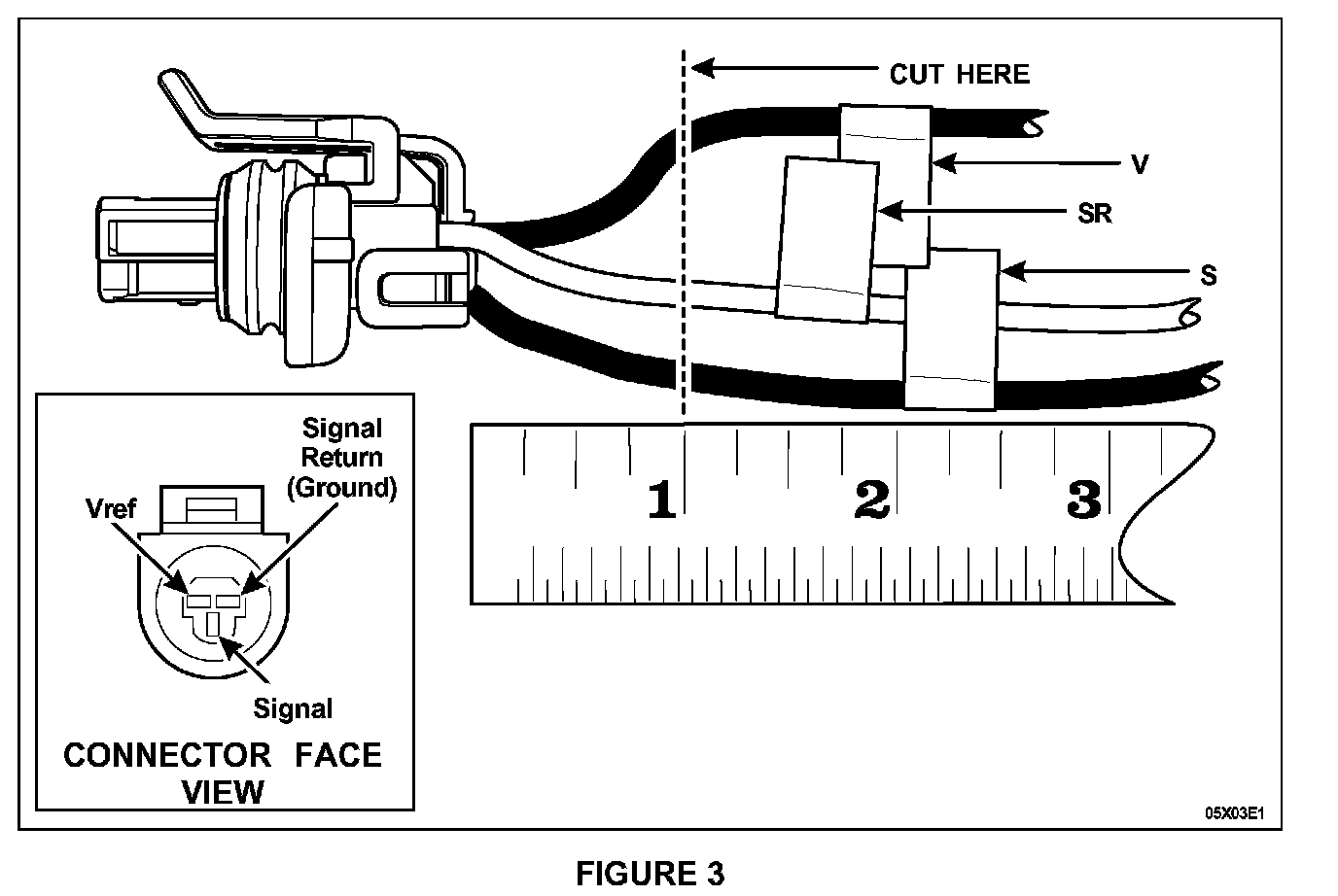 8. Cut the wires about 25 mm (1 inch) behind the connector on the vehicle harness MAKING SURE TO LEAVE THE IDENTIFYING TAGS ON THE HARNESS and discard the old connector. See Figure 3.