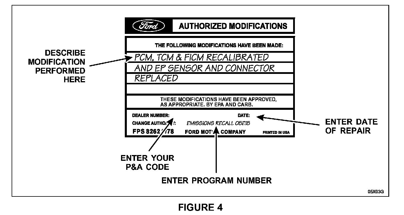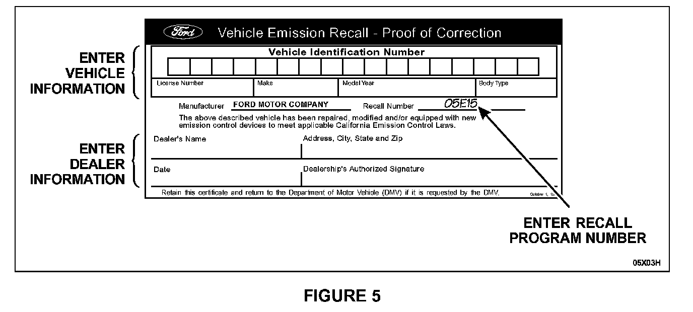 1. Provide the owners of vehicles registered in California and Massachusetts with a completed 'Vehicle Emissions Recall - Proof of Correction" certificate. See Figure 5.