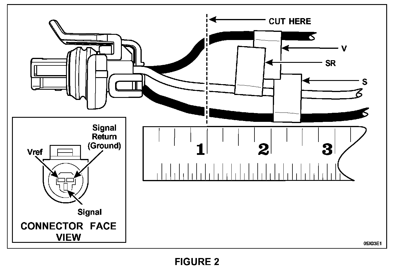 7. Cut the wires about 25 mm (1 inch) behind the connector on the vehicle harness MAKING SURE TO LEAVE THE IDENTIFYING TAGS ON THE HARNESS and discard the old connector. See Figure 2.