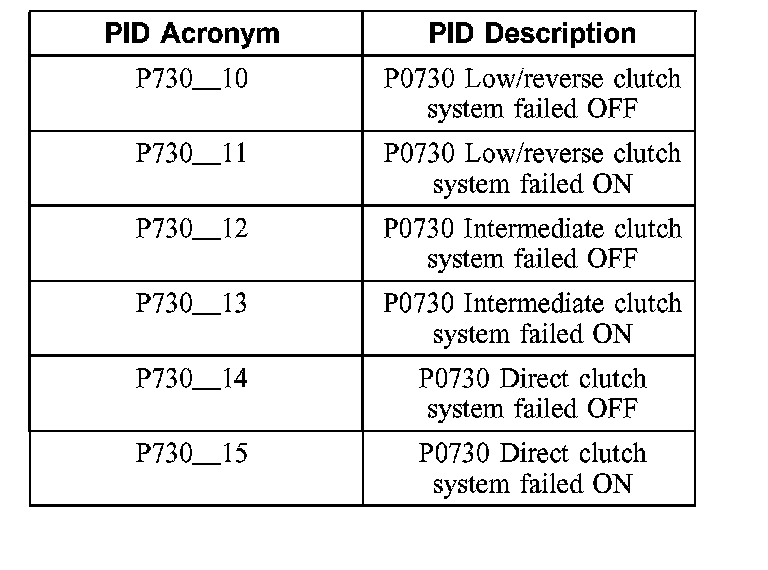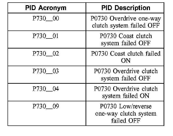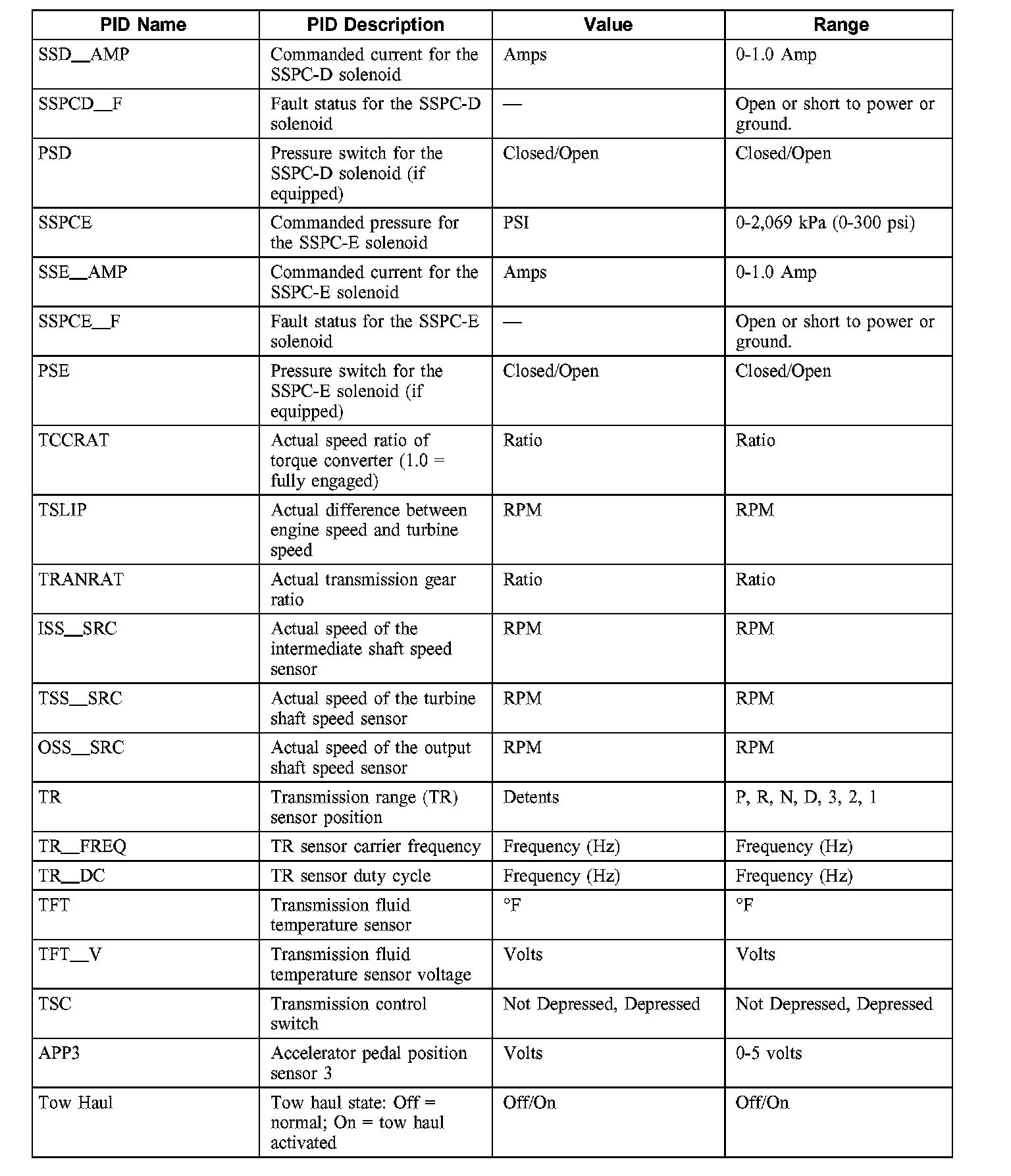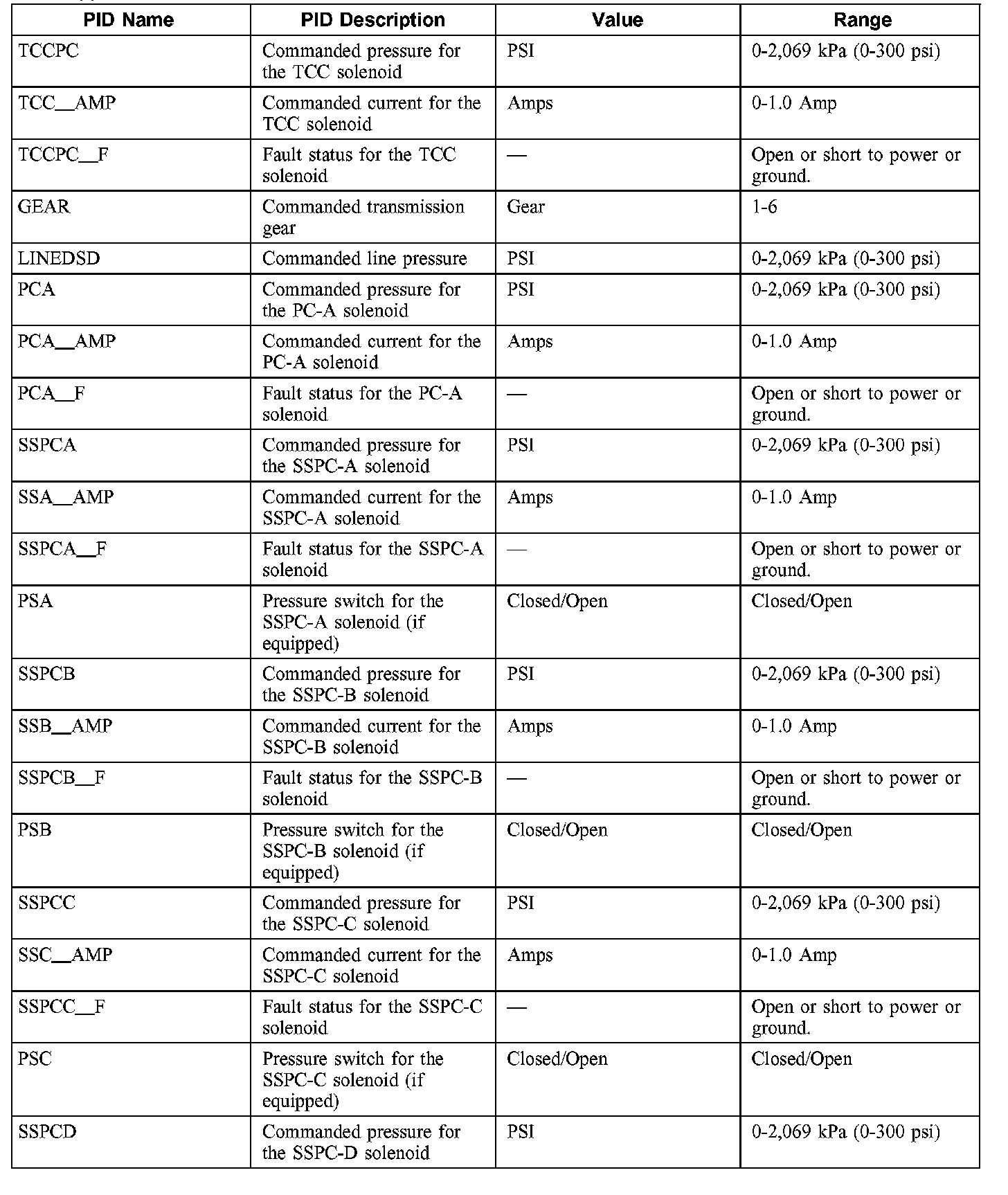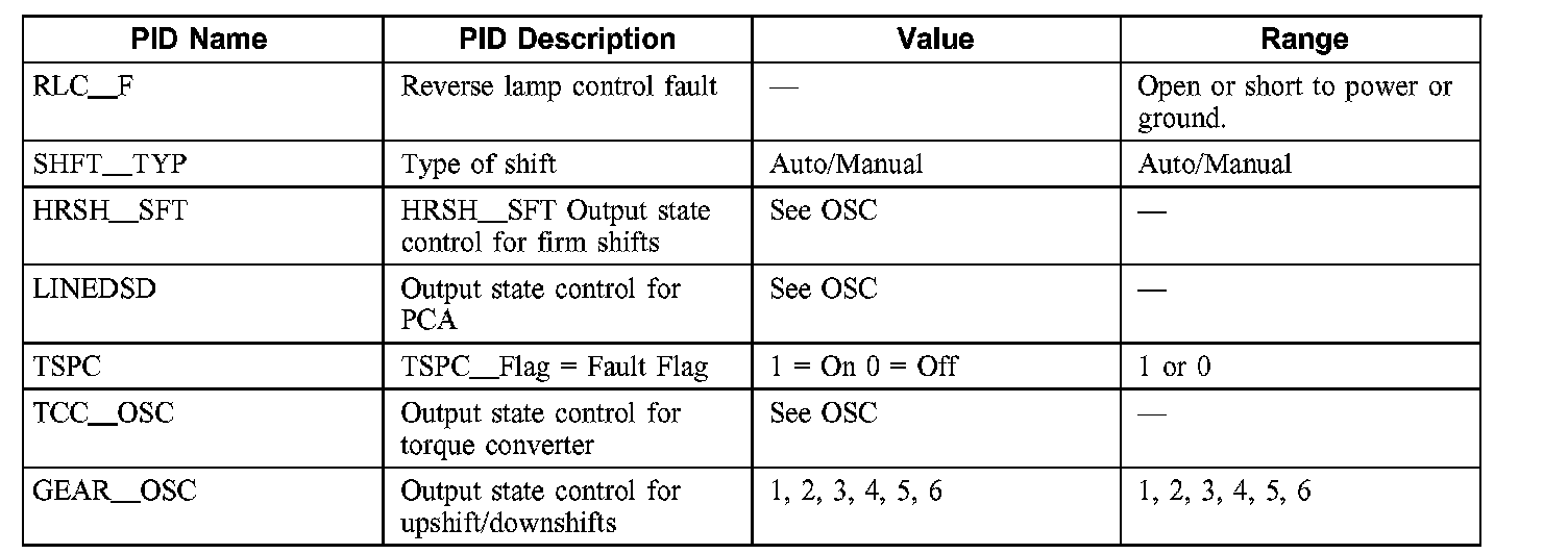 NOTE: The pressure switch PIDs listed in this table will not be applicable to all vehicle applications. Some vehicles will not have the pressure switches installed in the valve body.