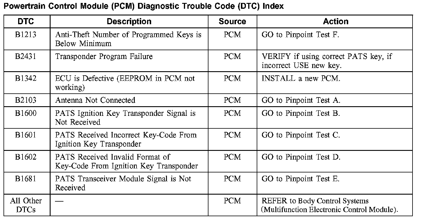 Powertrain Control Module (PCM) Diagnostic Trouble Code Index